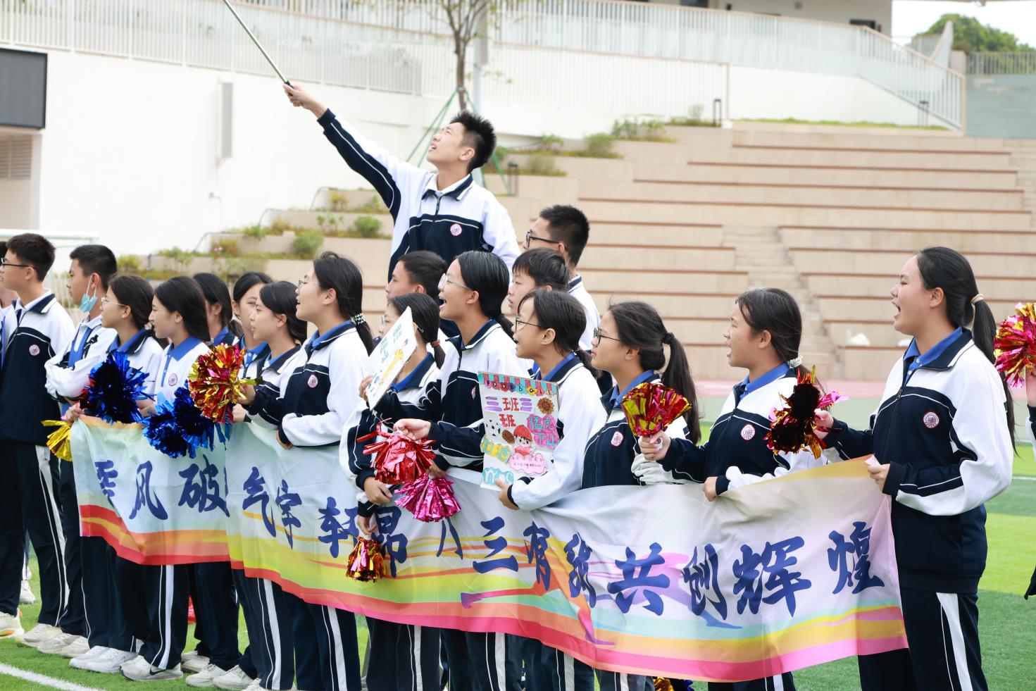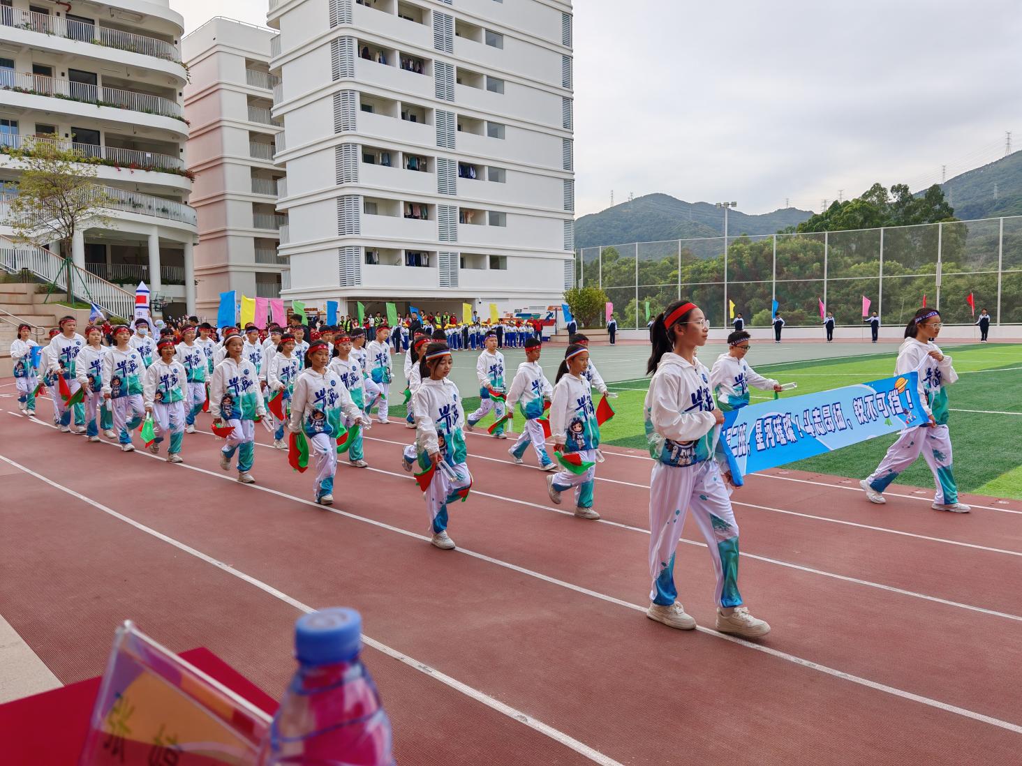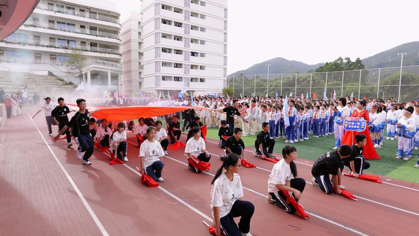 运动会开幕式上,《运动员进行曲》雄壮奏响,各方阵依次登场。国旗护卫队英姿飒爽,国旗在阳光下熠熠生辉;校徽方阵步履坚定,校训精神胸前闪耀;彩旗方阵朝气蓬勃,旗帜迎风招展;鲜花队手持繁花,口号嘹亮铿锵,为盛会注入满满活力。各班级方阵创意十足,小学部四(1)班的“火箭班”以航天服、渐变扇演绎“挑战自我” 的信念,五(2)班的“瓶子舞” 独具特色,以灵动姿态绽放别样风采;八(2)班学子手持巨型国旗奔入跑道,以“八二第一,中国第一”的呐喊告白祖国,尽显少年赤诚。