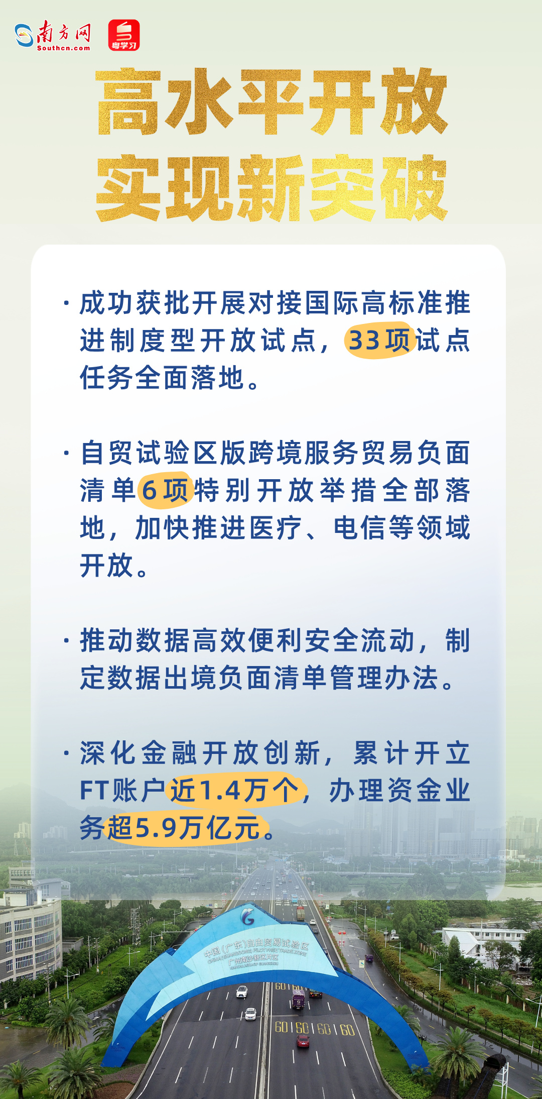 党的二十届四中全会提出,稳步扩大制度型开放,维护多边贸易体制,拓展国际循环,以开放促改革促发展,与世界各国共享机遇、共同发展。自成立以来,广东自贸试验区坚持以制度创新为核心,加快推动高水平开放和高质量发展,越来越成为改革创新“试验田”、对外开放“新高地”。