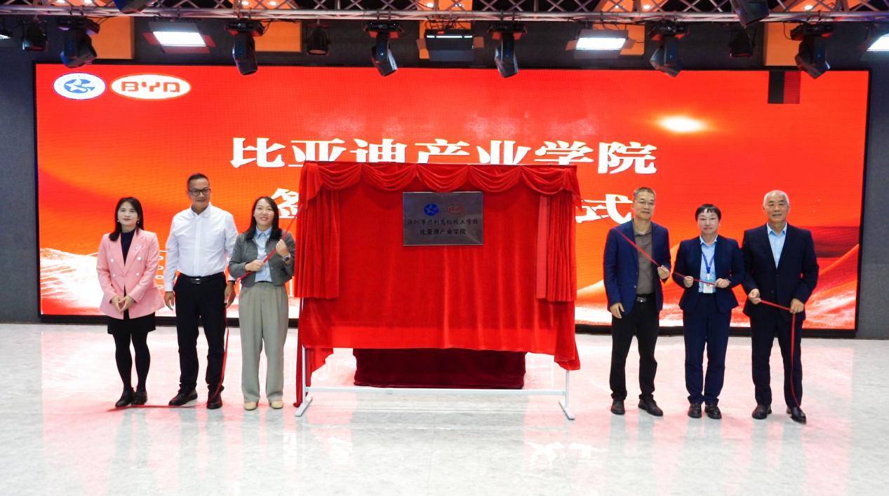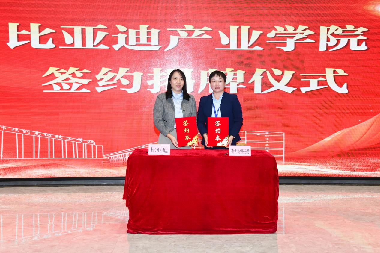 在全体与会者的见证下,深圳市携创高级技工学校党委书记、校长伊俊宏与比亚迪人力资源处地区人力资源一部总监强雁蕾共同签署产业学院合作协议,并与参会领导共同为“比亚迪产业学院”揭牌。这一里程碑式的合作,标志着校企双方将在人才培养等方面展开更深层次联动,为新能源汽车领域输送更多高素质技术技能人才。