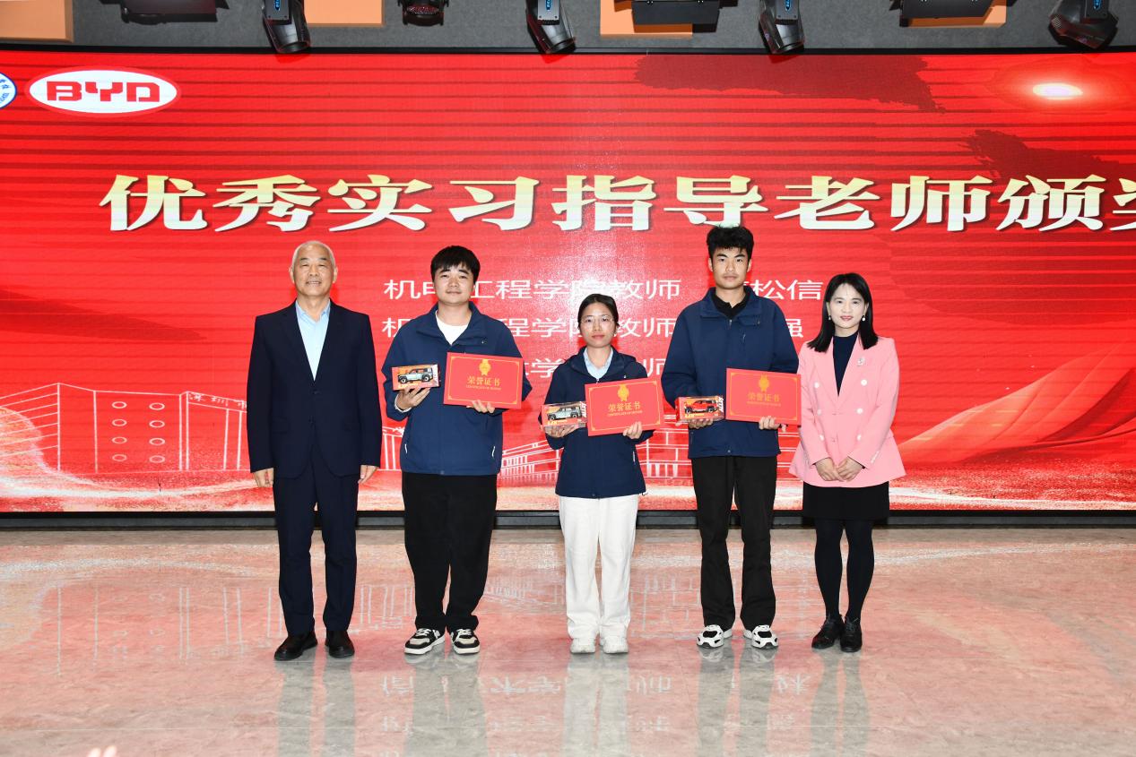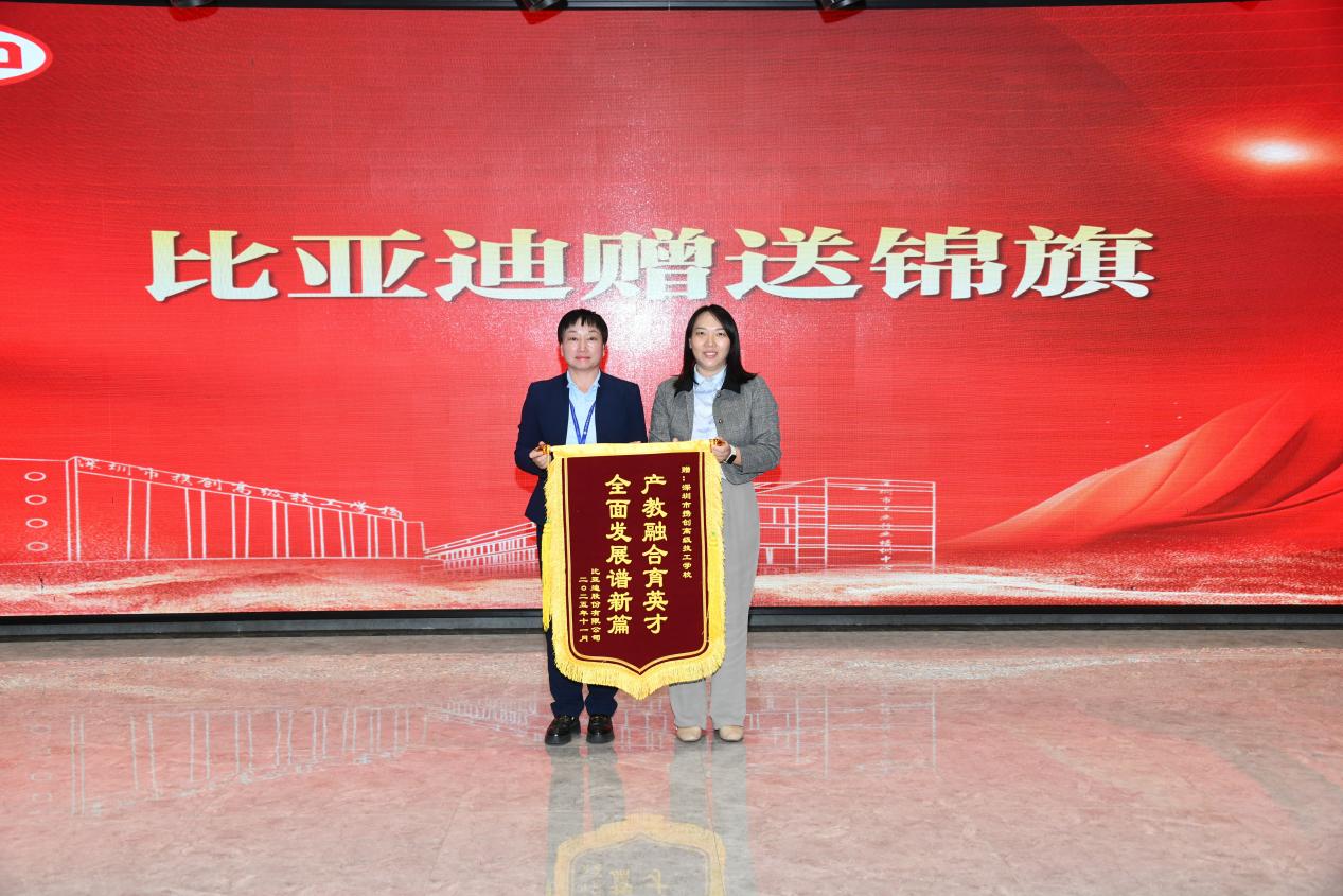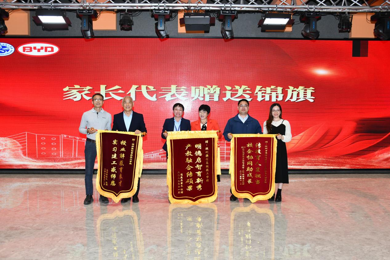 现场还举行了隆重的表彰环节,与会领导为受到表彰的个人及集体代表颁发荣誉证书及比亚迪车模。他们的卓越表现,充分展现了携创学子精益求精的工匠精神和教师团队的育人担当。 学生代表2024级新能源汽车检测与维修专业叶铭然分享实习感悟时称,在比亚迪车间实践的经历让他深刻体会到“工匠精神蕴含于每一处细节的严谨”。家长代表陈明则表示,孩子通过工学交替不仅提升了技能,更学会了责任与担当,对学校搭建的产教融合平台深感欣慰。随后家长代表与比亚迪公司向学校赠予锦旗,彰显了三方互信互助、合作共赢的坚实基础。