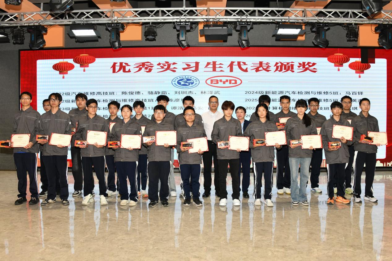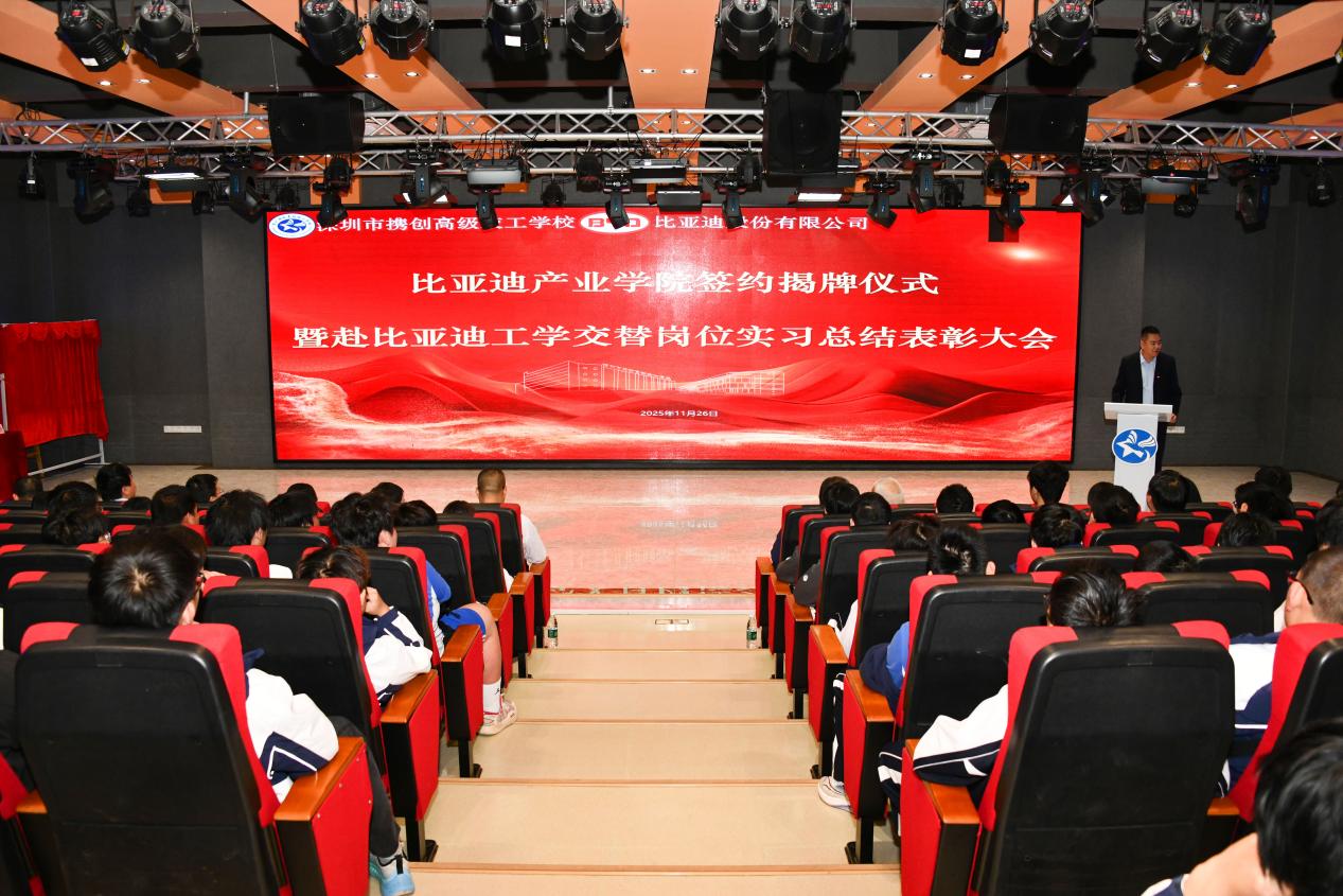 深圳新闻网2025年12月1日讯(记者 田志强)近日,深圳市携创高级技工学校与比亚迪股份有限公司共建的“比亚迪产业学院”签约揭牌仪式暨赴比亚迪工学交替岗位实习总结表彰大会在学校学术报告厅隆重举行。