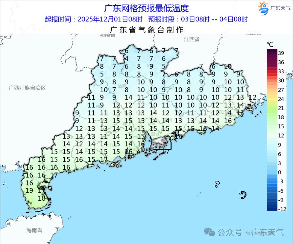 12月4日,粤西和珠三角沿海市县阴天到多云,有分散零星小雨,其余市县多云,局部有小雨。最低气温:粤北大部、云浮和珠三角北部市县6~11℃,南部沿海市县17~19℃,其余大部分市县12~16℃