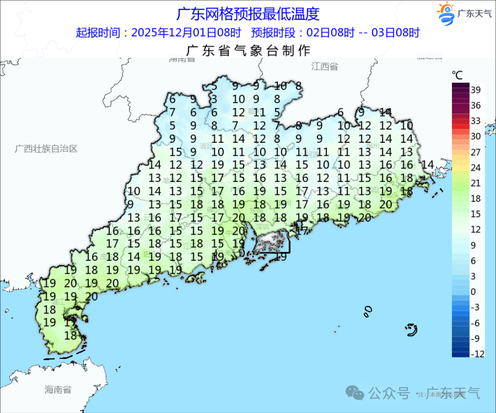 12月2日夜间-3日,清远和韶关北部、南部沿海市县阴天到多云,有分散零星小雨,其余市县多云到阴天,局部有小雨。最低气温:粤北大部、肇庆北部市县8~13℃,南部沿海市县18~21℃,其余市县13~18℃。
