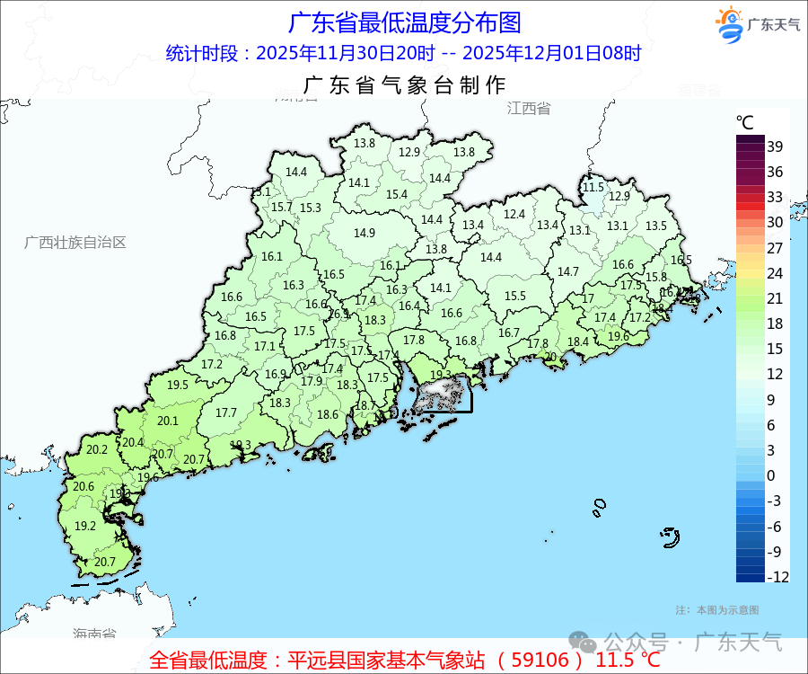 另外,云层像“棉被”一样,在夜间具有保温的效果。1日早晨,粤北、珠三角北部的部分市县最低气温较30日上升了4~9℃,具体分布:粤北市县介于12~16℃,南部沿海市县介于18~21℃,其余市县介于16~18℃,梅州平远最低气温11.5℃。