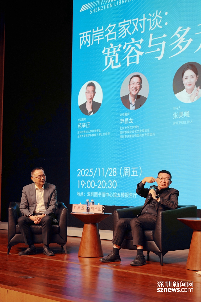 活动现场,两岸名家——台湾大学哲学教授苑举正与深圳市政协文化文史委主任尹昌龙,以“宽容与多元文化”为主题在文化基因的共通性、当代社会的哲学回应及两岸青年一代的文化联结等方面进行对谈,与现场200多位观众一起感受AI时代下两岸文化认同的情谊与力量。
