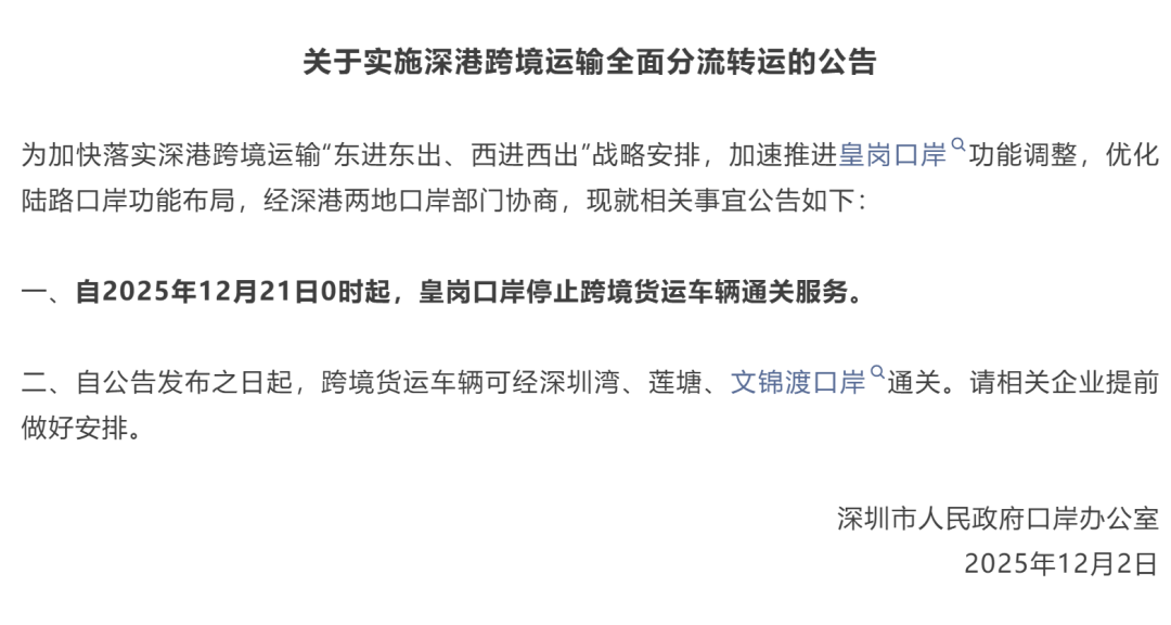 ● 自2025年12月21日0时起,皇岗口岸停止跨境货运车辆通关服务。