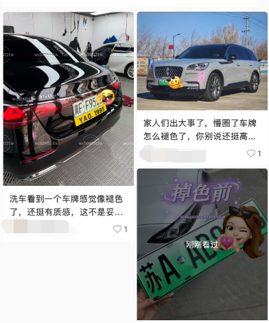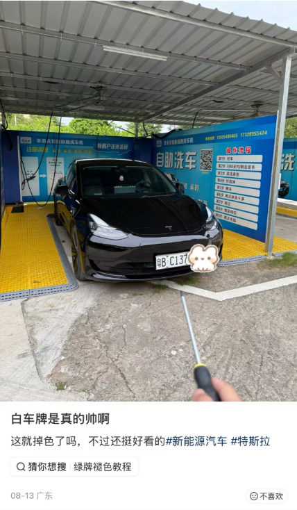 记者在一些社交平台上看到,有网友发布帖文,展示其将新能源车的绿色牌照改为白色牌照。发布者多配以“追求个性”“颜色统一更好看”“白牌配车身更协调”等文案,这其中不乏“粤B”车牌。部分帖文甚至获得了不少点赞和好奇的询问。