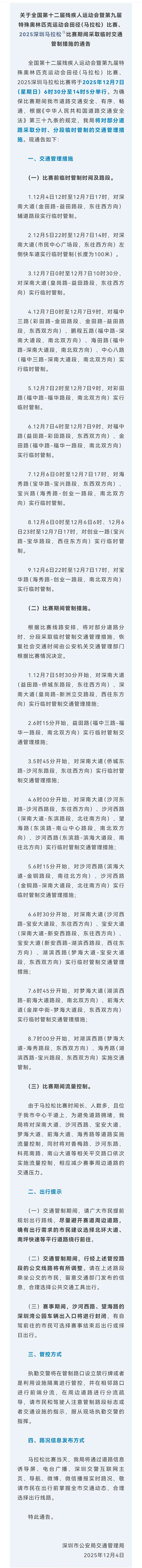 ● 2025深圳马拉松比赛将于12月7日(星期日)6时30分至14时5分举行。深圳将对部分道路采取分时、分段临时管制的交通管理措施。