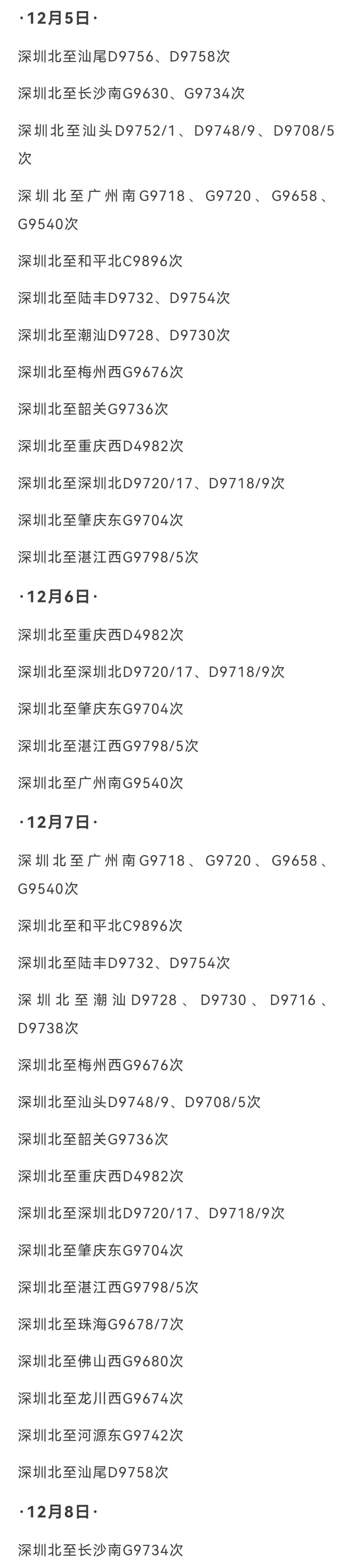 ● 12月5日至12月8日:加开多趟深圳出发的动车组列车。