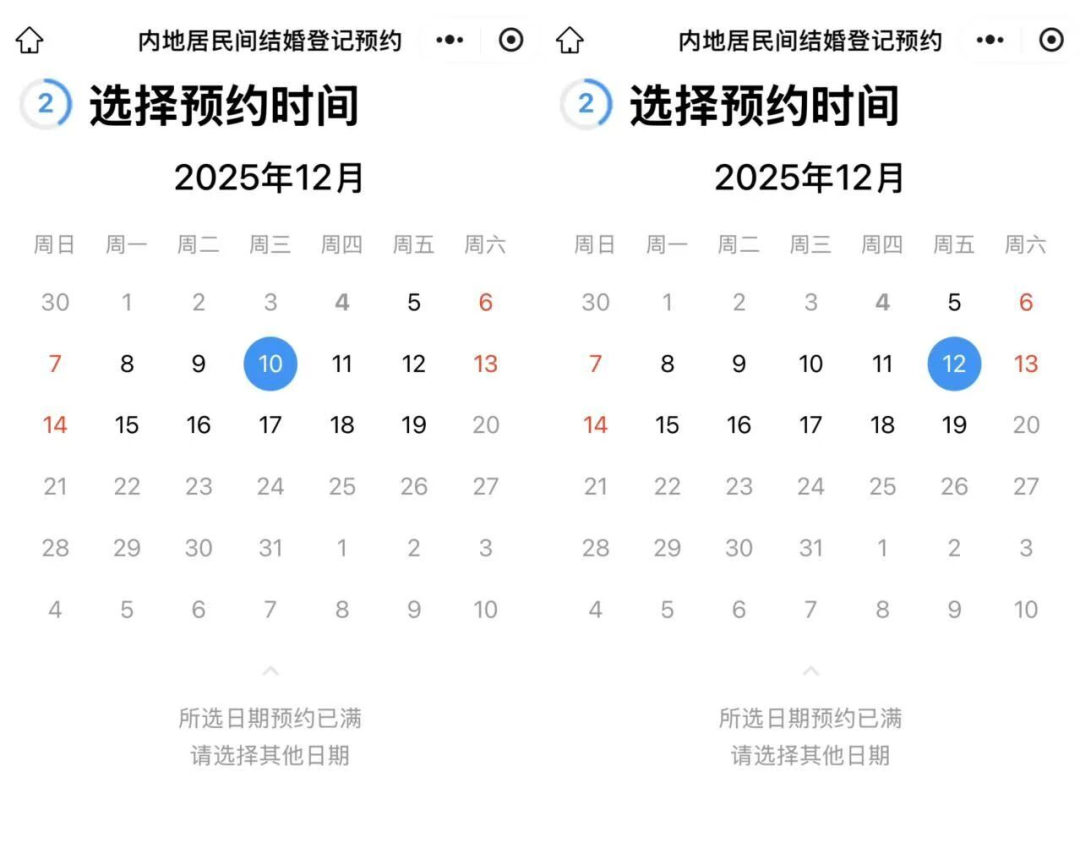 记者在粤省事微信小程序看到,福田区和南山区婚姻登记处12月10日和12日已经约满,罗湖区12月10日也显示约满,其余日期预约号量较为充足。