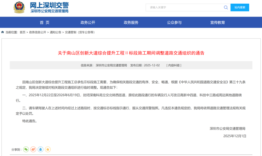 ● 近日,深圳市公安局交通管理局发布公告,因道路施工需要,为确保相关路段交通有序、安全、畅通,南山区部分路段将封闭半年。详情>>