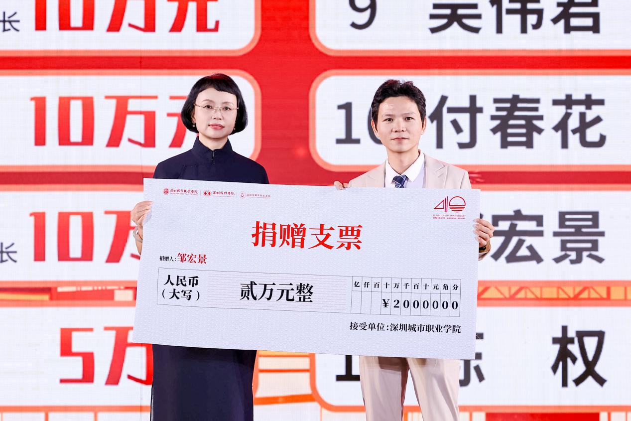他也经常作为特邀嘉宾回到母校开设讲座,为学弟学妹分享自身的实践经历,解答他们在就业方面的疑惑。在他看来,自己的成长早已刻上母校的印记。他仍记得母校“求真务实,德技双馨”的校训,正是这份信念让他拒绝投机取巧,脚踏实地地做好每一步努力。2025年11月2日在深圳城市职业学院(深圳技师学院)建校40周年活动上,邹宏景向母校捐赠,回馈母校的培育。