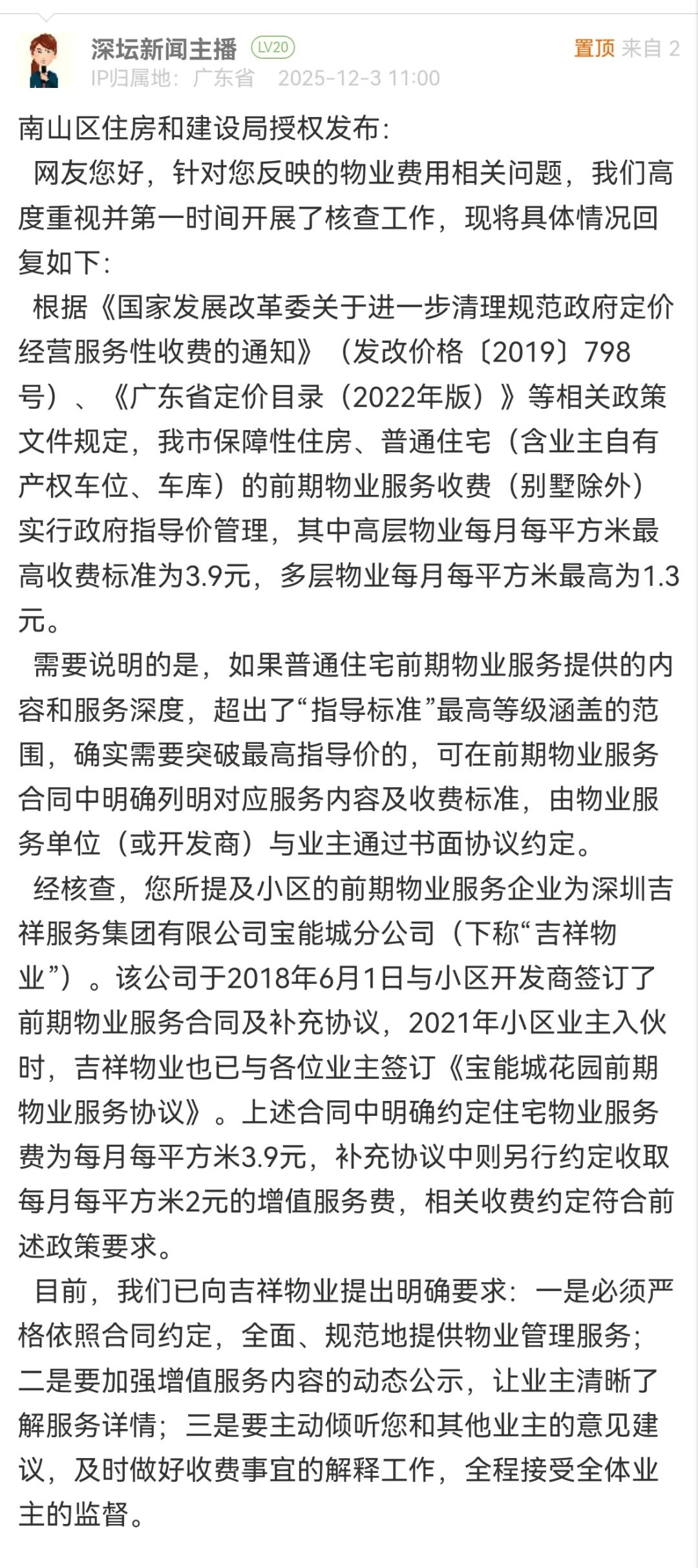 ● 深圳一小区物业被曝收费差价高达51%,最新回应:相关收费约定符合前述政策要求。