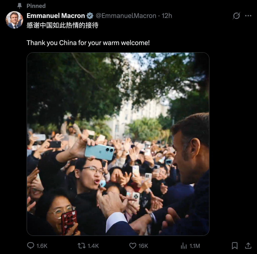 ● 12月6日,法国总统马克龙在社交媒体上发布了此次访华的集锦视频,并用中文表示:感谢中国如此热情的接待。