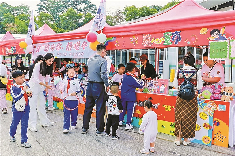 赛场之外,同步开启的“爱心童市”热闹非凡,成为践行循环理念的生动课堂。来自龙华区玉龙学校的100多位少先队员们化身“环保小掌柜”,通过旧物交换、低价义卖、环保手作体验等形式,体验资源循环利用的价值,让绿色低碳理念延伸至生活实践,形成了“知”与“行”的结合。