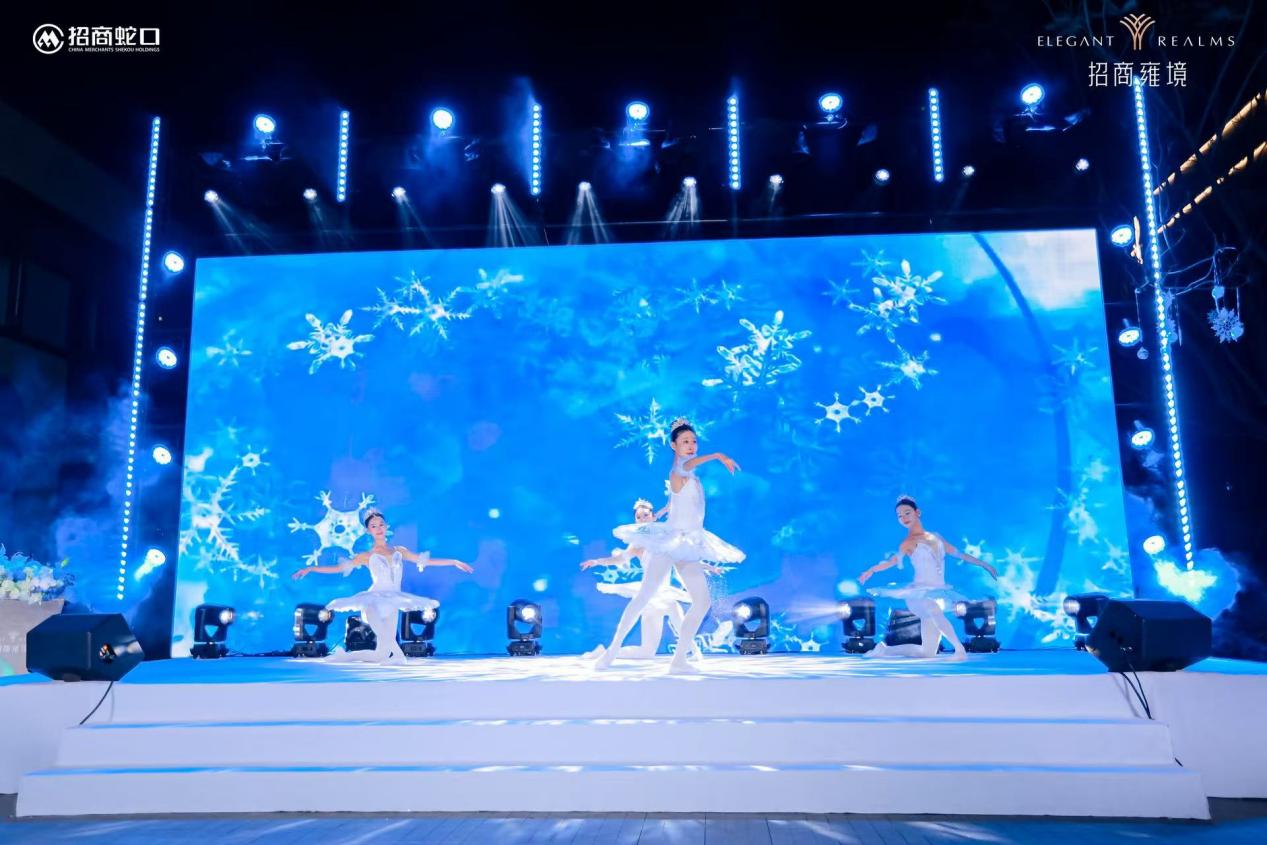 舞台上,冰雪芭蕾舞剧优雅上演,舞者足尖流转,以极致肢体语言诠释艺术与生活交融的浪漫想象。穹顶之上,流光漫舞,不仅营造出梦幻氛围,更将前海澎湃发展的时代情绪与招商雍境的产品温度紧密相连。