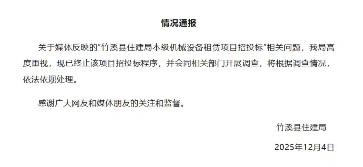 12月4日,针对上述招标的评审名单,竹溪县住建局发布通报称,现已终止该项目招投标程序,并会同相关部门开展调查,将根据调查情况,依法依规处理。同日,中国政府采购网又发布了一则名为《竹溪县住房和城乡建设局本级关于机械设备租赁采购终止公告》,其中提到项目终止的原因:在采购招标过程中程序不规范,存在工作失误,现终止本项目采购活动。