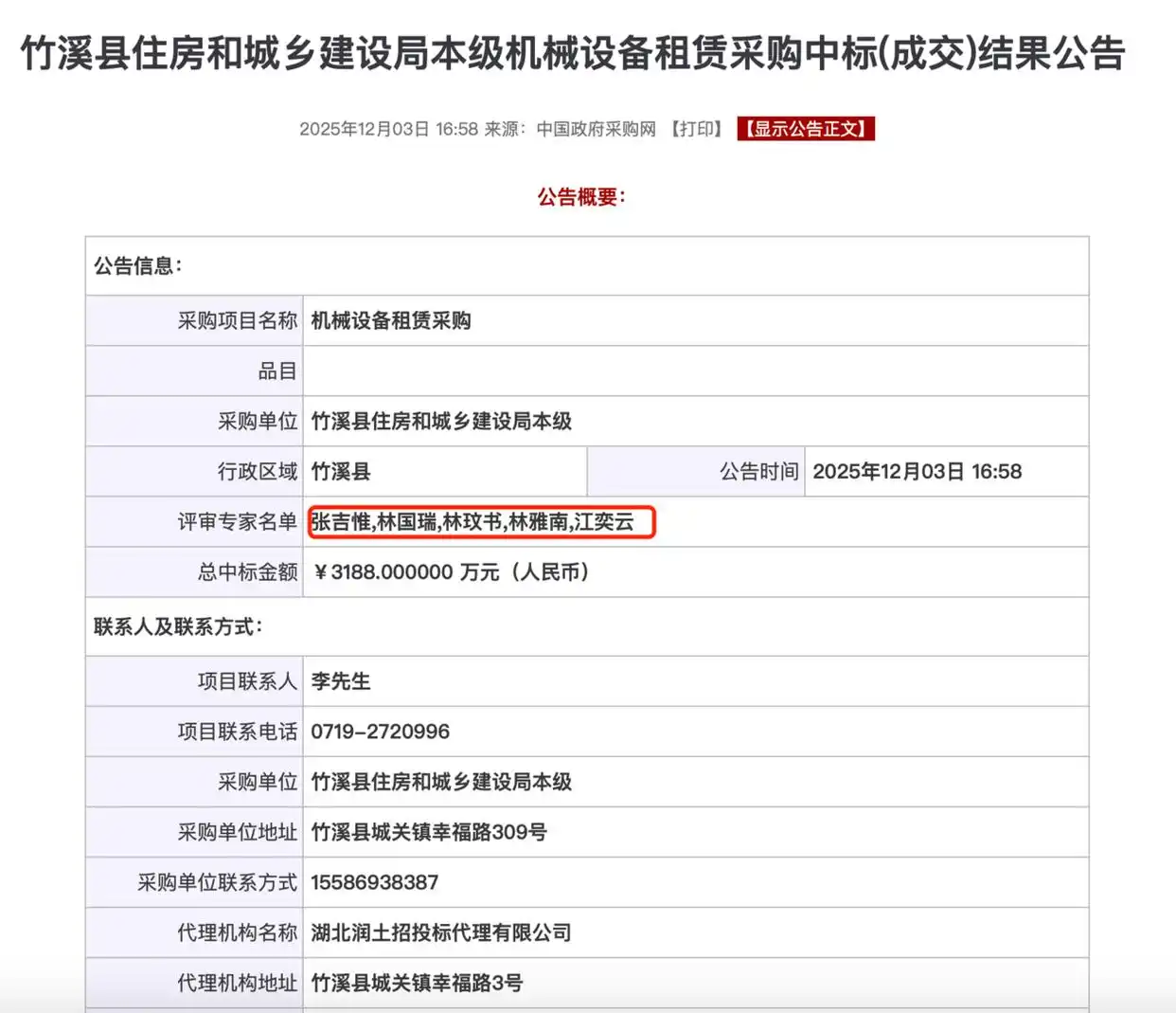 12月3日,有网友爆料称,在当日公布于中国政府采购网中的“竹溪县住房和城乡建设局本级机械设备租赁采购中标(成交)结果公告”第五项评审小组成员中,5位评审小组成员名字“张吉惟、林国瑞、林玟书、林雅南、江奕云”与百度文库《10000中国普通人名大全》前五个名字完全一致,此事引发网友热议。
