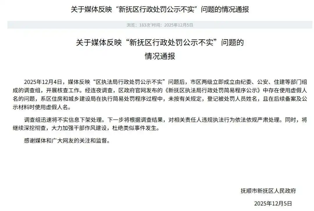 12月5日,抚顺市新抚区政府也发布通报,回应“行政处罚名单”与百度文库名单撞名一事。通报称,经连夜调查,区住房和城乡建设局在执行简易处罚程序过程中,未按规定登记被处罚人员姓名,且在后续备案及公示材料时使用虚假人名。调查组已迅速将不实信息下架处理,下一步将根据调查结果,对相关责任人违规执法行为依法依规严肃处理。
