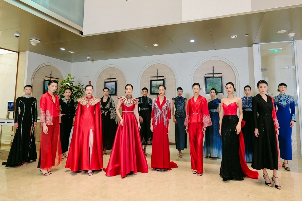 设计上,品牌将云肩、褂服、立领、旗袍等中国服饰元素,与欧式礼服的立体结构融合,并融入江崖海水纹、祥云、瑞鸟等吉祥纹样,使礼服兼具东方文化内涵与国际时尚气质,展现“非遗×高定”的可能性。