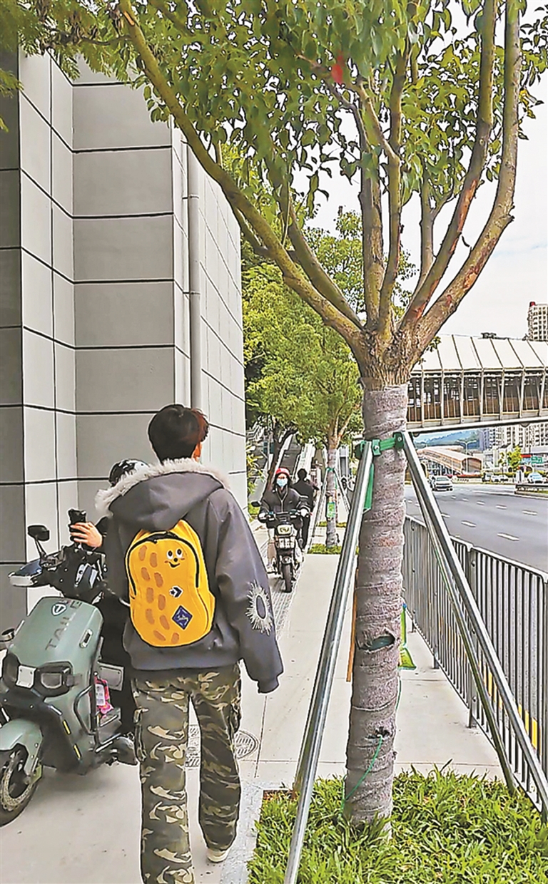 记者观察发现,这几棵树不远处还有座天桥,天桥与人行道的行人和电动自行车在狭窄处交汇时,需要小心翼翼地交错通行,确实存在安全隐患。“这条路修好没多久,新栽的树位置不太合理,每次经过时要左右腾挪,很容易发生剐蹭。”住在附近的吴先生告诉记者。