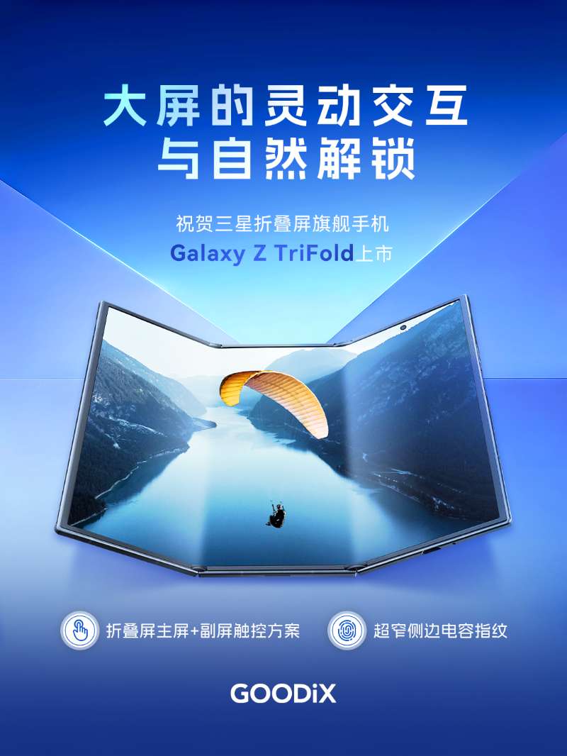 深圳新闻网2025年12月9日讯(记者 张俊达)近日,三星正式发布折叠屏旗舰手机Galaxy Z TriFold。汇顶科技为这款重磅旗舰提供全球领先的折叠屏主屏+副屏触控与超窄侧边指纹方案,助力打造更沉浸的巨屏交互与便捷解锁体验。