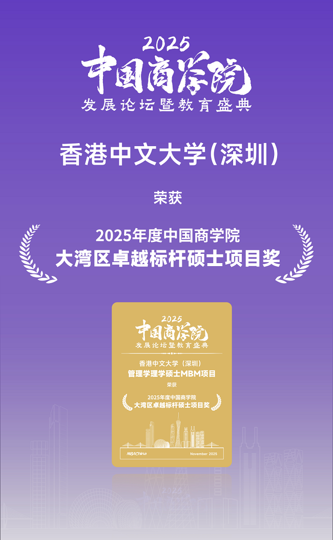 在本次盛典中,香港中文大学(深圳)管理学理学硕士MBM项目凭借其卓越的办学理念、创新的培养模式与显著的育人成果,成功斩获“2025年度大湾区卓越标杆硕士项目奖”。