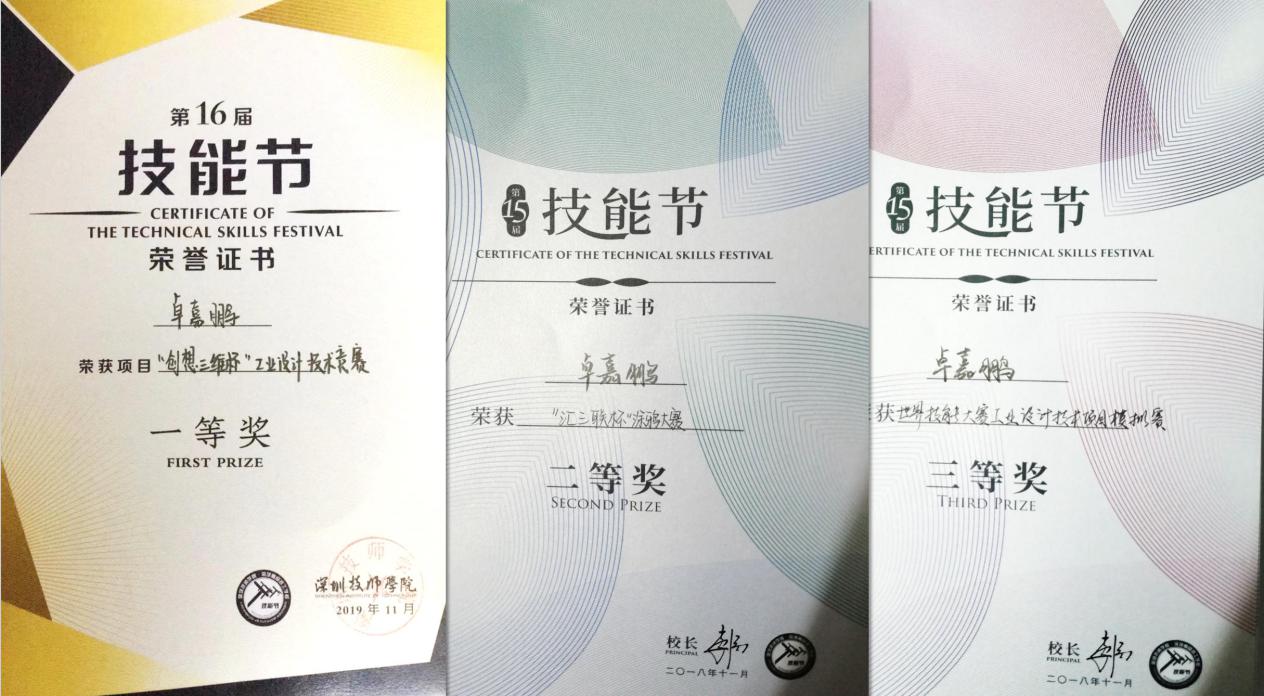 2019年,在深圳城市职业学院(深圳技师学院)第十六届技能节上,卓嘉鹏凭借扎实的技能拿下创想三维工业设计技术竞赛全场唯一一等奖——这是他在学校技能赛事中首次登顶,更让他获得了进入优质校企合作项目组的机会。“第一次参加只拿了三等奖,是老师一直鼓励我‘再试一次’,学校的技能节也给了我不断试错、成长的舞台。”正是这段校园经历,让他的多项设计获得企业认可并投入量产,为后续赛场征程打下坚实基础。