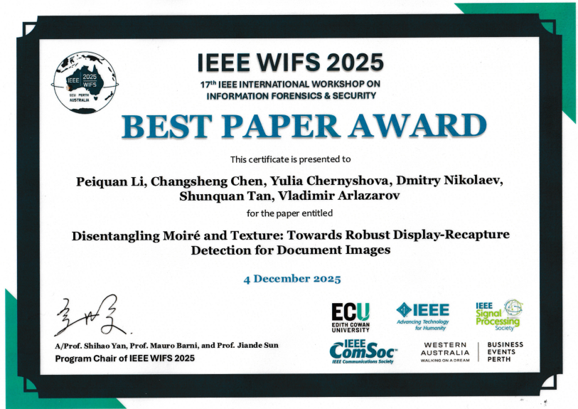 深圳新闻网2025年12月10日讯(记者 王茜)近日,深圳北理莫斯科大学工程系科研团队与俄罗斯合作机构共同完成的研究成果,在IEEE International Workshop on Information Forensics and Security(IEEE WIFS 2025)上成功发表,并荣获大会“最佳论文奖”(Best Paper Award)。IEEE WIFS是IEEE信号处理学会(IEEE Signal Processing Society, IEEE SPS)旗下的重要旗舰学术会议之一,聚焦信息取证、安全与可信人工智能等前沿方向。本届会议由IEEE SPS主办,具有严格的学术评审机制和国际科研影响力。