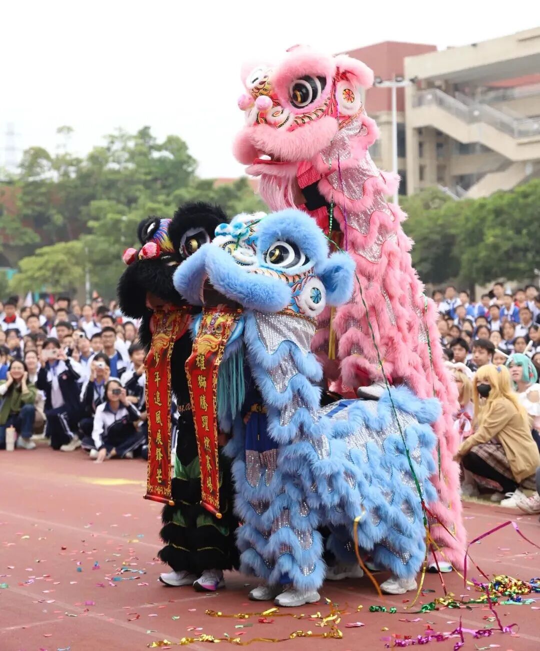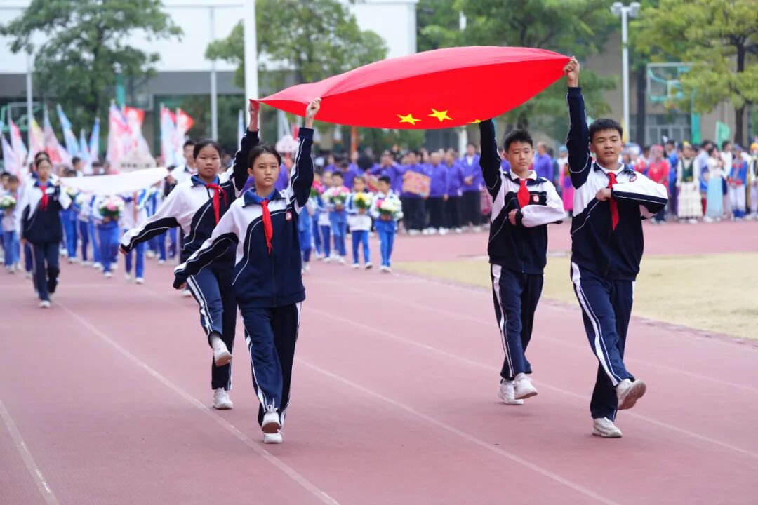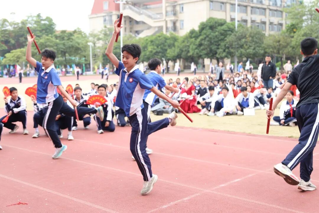 尤为引人注目的是,多个班级以“红旗飘扬”“祖国版图”等为主题设计队形与表演。压轴入场的醒狮队将开幕式推向高潮。随着激烈的鼓点,粉、蓝、黑三色醒狮腾跃翻滚、摇头摆尾,灵动的身姿与默契的配合瞬间点燃全场,欢呼声与掌声经久不息。