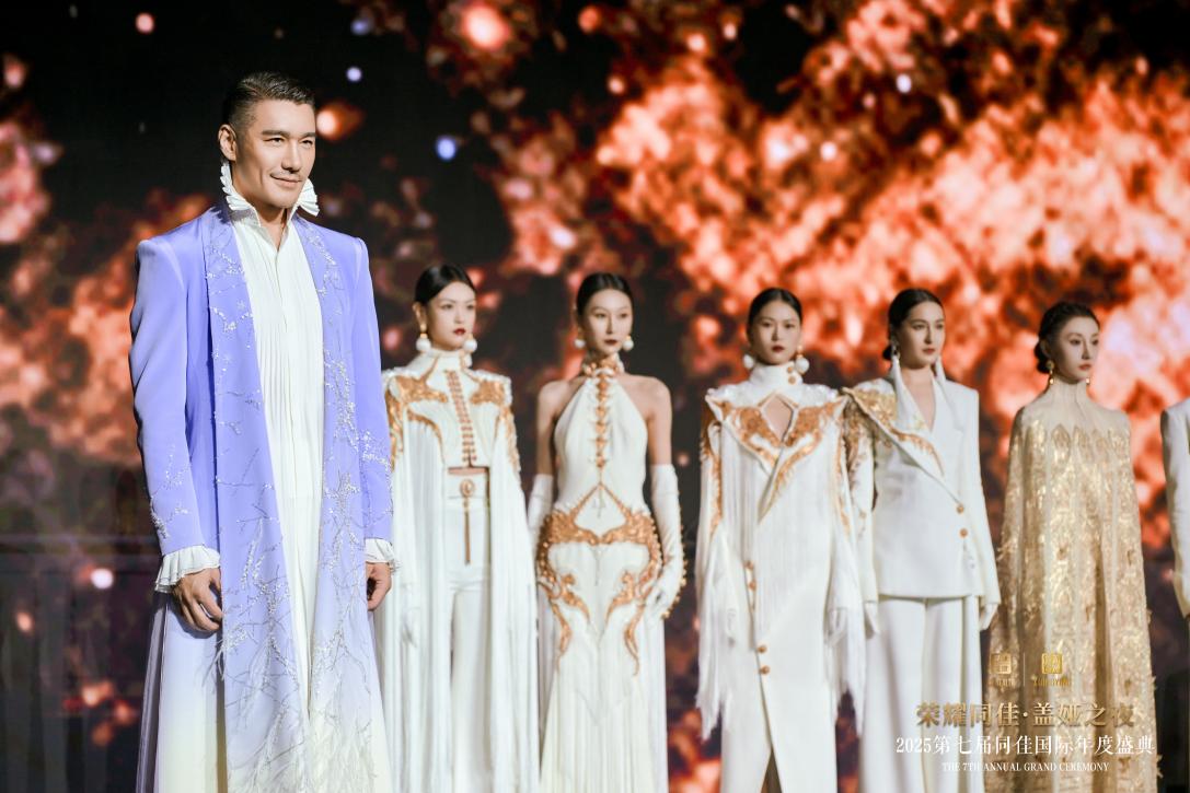 盛典的压轴环节,由伦敦时装周全球大使胡兵领衔的盖娅传说服装展示,将盛典推向高潮。模特身着融合传统纹样与现代设计的华服,步履间尽显东方气韵。