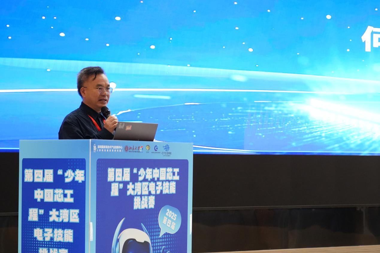 赛事开幕式上,中国科学院院士、深圳国际量子研究院院长俞大鹏通过视频致辞,高度评价赛事为"播种工程、筑基工程",指出其将前沿芯片科技融入基础教育,让青少年在动手实践中培育创新思维,在团队协作中感悟工程之美。他强调大赛体现"学思用贯通"的教育理念,寄语湾区学子立科技报国之志,在芯片这片星辰大海中勇敢探索,成为未来科技强国的中坚力量。深圳国家高技术产业创新中心副主任李林军在致辞中强调:“芯片人才培养必须从基础教育抓起,从少年时代启蒙。我们要为青少年搭建更多像‘少年中国芯’这样的平台,让创新之火在校园点燃,让科技之梦在童年扎根。”深圳市电子学会执行秘书长徐伟军、深圳市工赋数字化促进中心副主任孙顾珉分别从行业资源整合、产教融合实践等角度,对青少年芯片教育的战略意义表达了坚定支持。北京大学教授、深圳系统芯片设计重点实验室主任何进在发言中进一步指出:“我们不仅是在比赛,更是在播种。今天的每一次连线、每一块电路,都可能成为未来中国芯片产业的一次突破。”