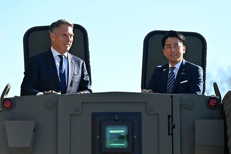 ▲当地时间2025年12月7日,日本东京,日本防卫省,澳大利亚副总理兼国防部长理查德·马尔斯(左)与日本防卫大臣小泉进次郎参观日本自卫队的一辆防地雷反伏击车。图源:CFP