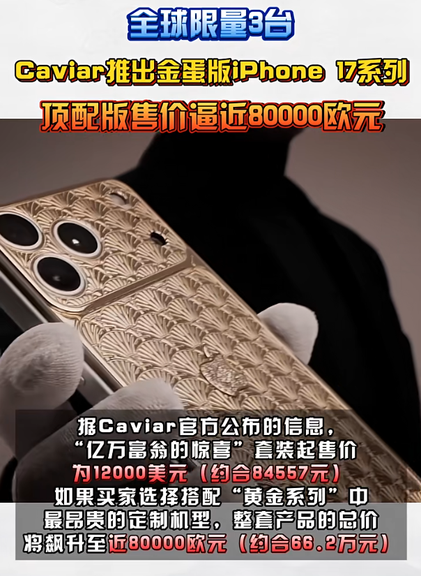 ● 近日,奢侈品定制品牌Caviar基于苹果iPhone 17 Pro的机型,推出“亿万富翁的惊喜”系列定制产品。该系列全球仅限量3件,目前已售罄。