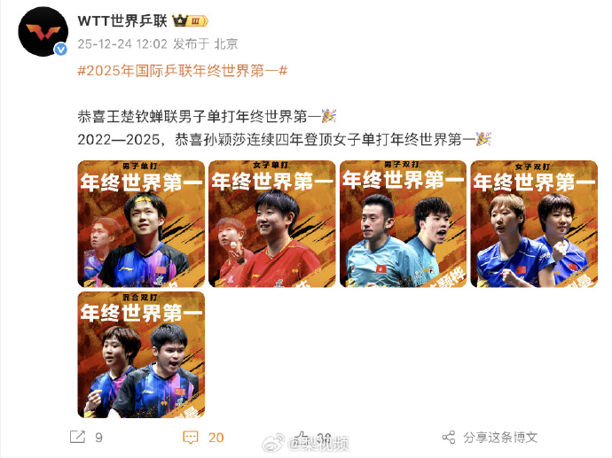 ● 24日,@WTT世界乒联发文:恭喜王楚钦蝉联男子单打年终世界第一,恭喜孙颖莎连续四年登顶女子单打年终世界第一 。