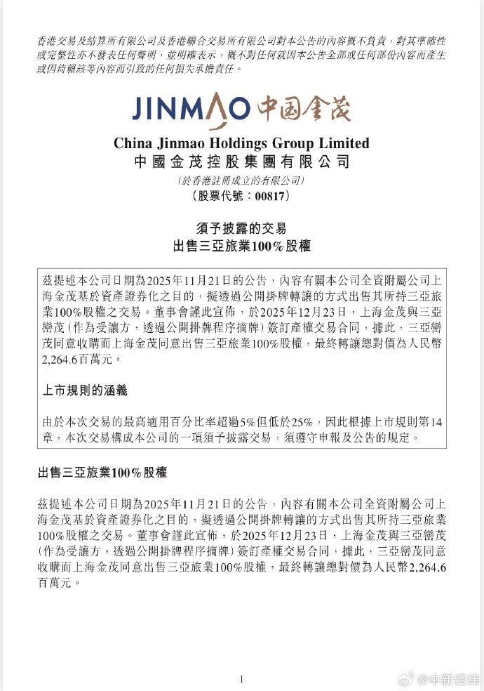 ● 22.6亿!中国金茂将三亚丽思卡尔顿酒店售予三亚峦茂。