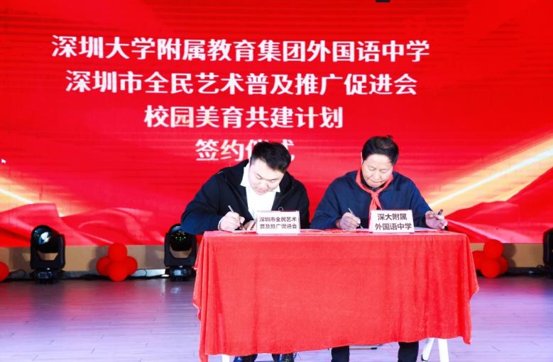 深圳大学附属教育集团外国语中学校长在致辞中表示,此次签约是学校美育改革的重要里程碑,将借助专业社会力量推动美育全面融入教育教学各环节,让美育浸润校园文化、滋养学生心灵,助力青少年成长为德智体美劳全面发展的时代新人。深圳市全民艺术普及推广促进会负责人回应,将整合优质艺术资源,搭建校园与社会文化场馆的沟通桥梁,共同探索可复制、可推广的校园美育模式,为青少年艺术素养提升与文化自信培育赋能增效。