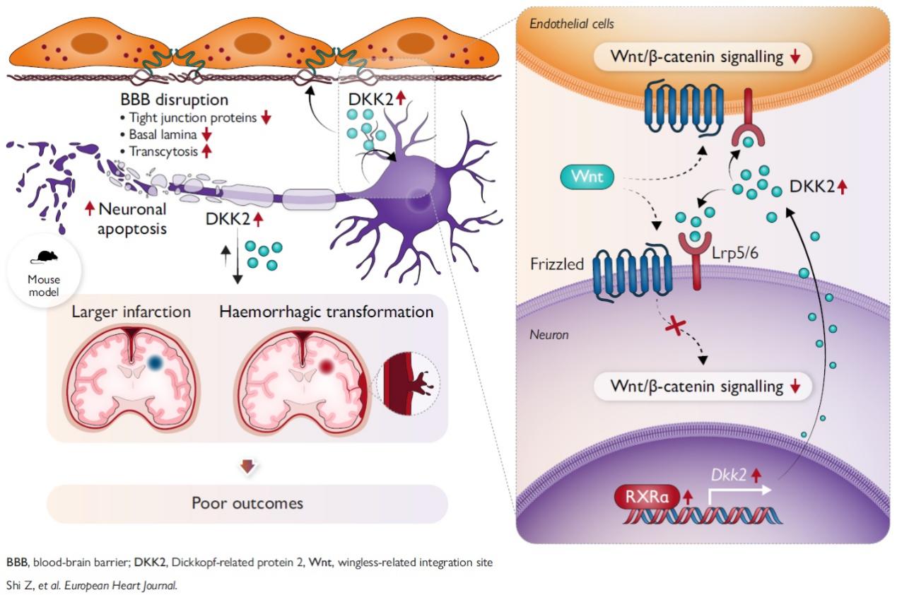 在该研究中,科研团队经过长期大量的探索,找到了缺血性脑卒中后推动大脑神经血管损伤扩大的“幕后推手”。他们发现,脑缺血后,部分受损区域的神经元会大量分泌一种名为DKK2的蛋白质,DKK2会抑制一条对神经细胞存活和血管稳定至关重要的信号通路—— Wnt/β-catenin 信号通路,最终导致神经元损伤加剧,并破坏大脑的血脑屏障,后者损坏后诱发神经炎症,进一步促进神经细胞死亡。