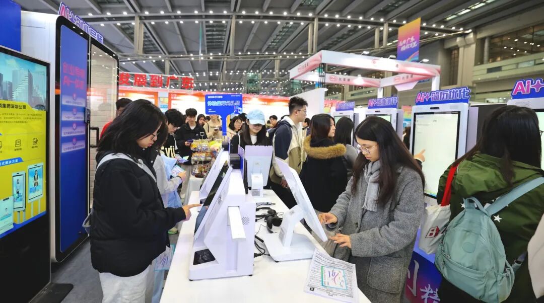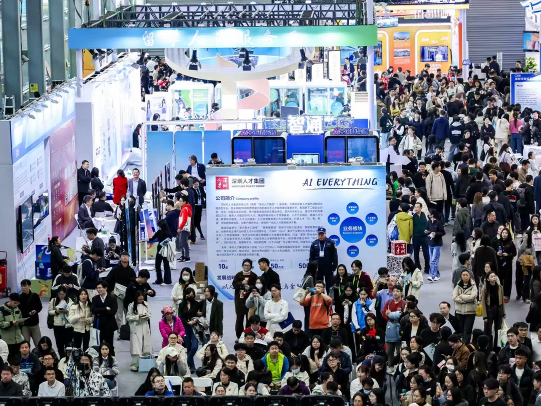 整个深圳馆以“鲲鹏展翅”为造型,蓝绿渐变色模拟“山海相连”,华为、中兴等企业的最新产品(含AI大模型、空气悬浮显示、3D打印设备)集中展出,让求职者直观感受“深圳创新力”。