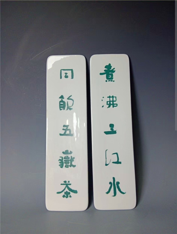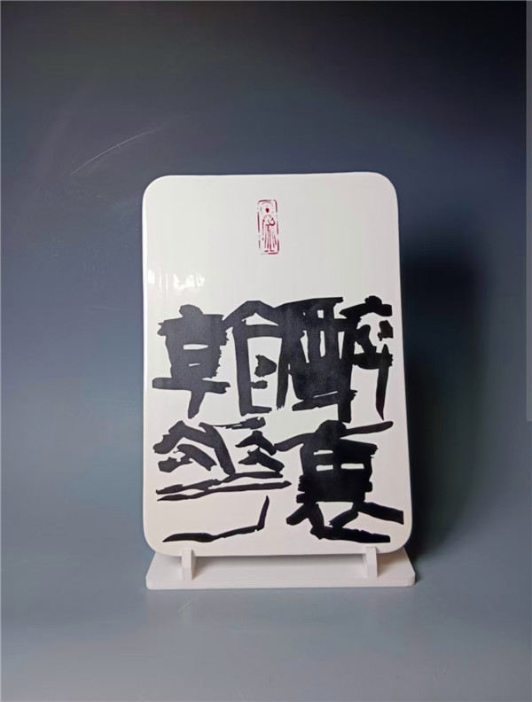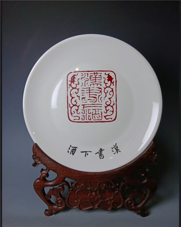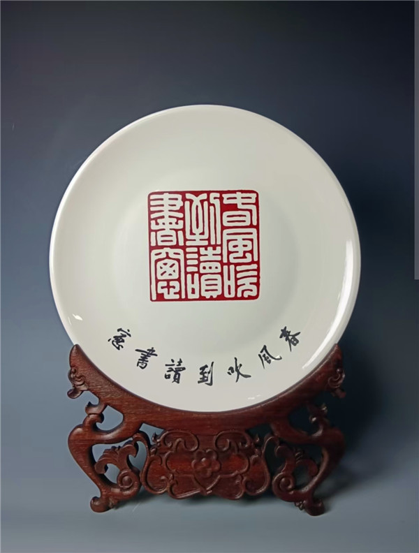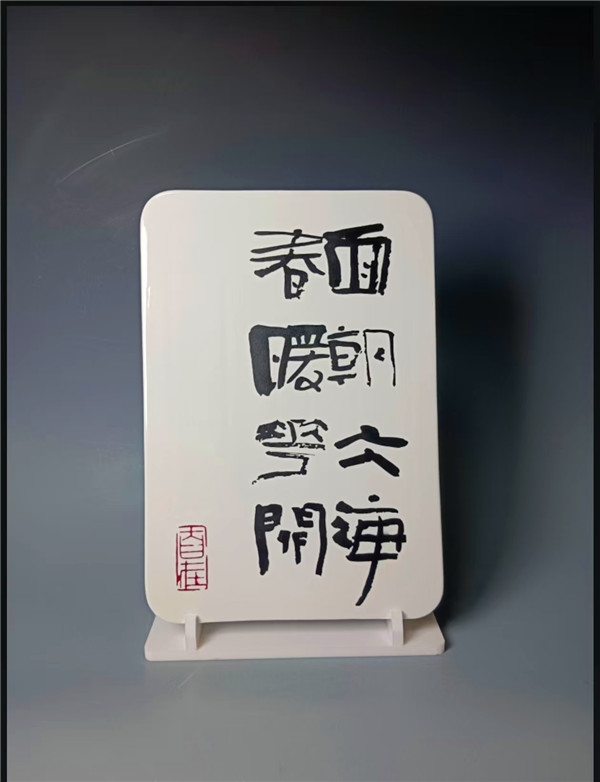 在布局设计上,潘文平深谙传统书画的构图之道。其作品《诗酒趁年华》以40公分直径的瓷盘为载体,盘心刻上“诗酒趁年华”的篆刻印章纹样,字体排布疏密有致,篆法古朴典雅,盘沿辅以手写书法题字,印章与书法相互呼应,让瓷盘的视觉层次丰富而和谐;《面朝大海,春暖花开》则以40×28公分的矩形瓷板为基底,书法文字纵向排布,左侧点缀一方小巧篆刻印章,留白与刻绘的平衡,让作品兼具现代装饰感与传统文人气息。