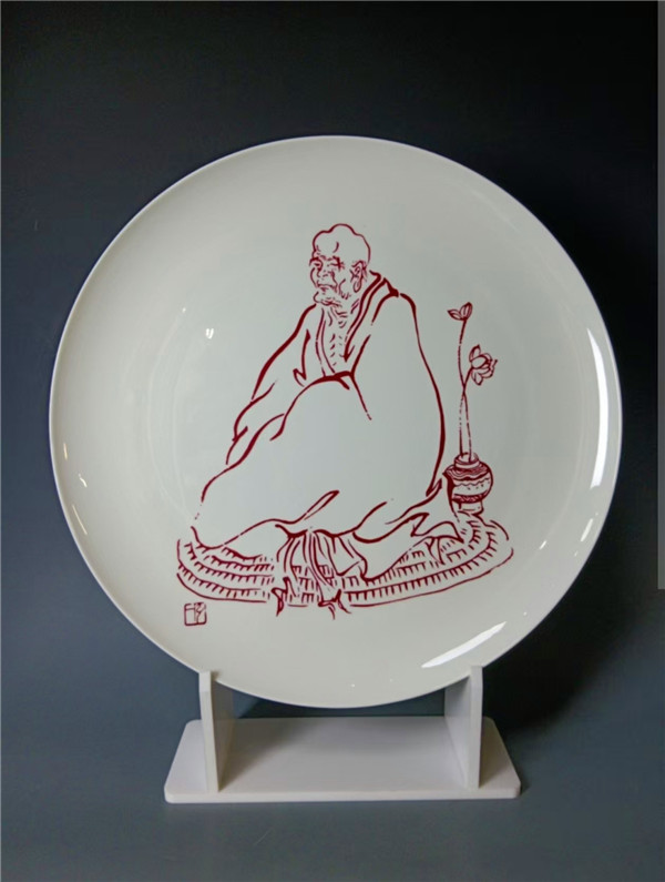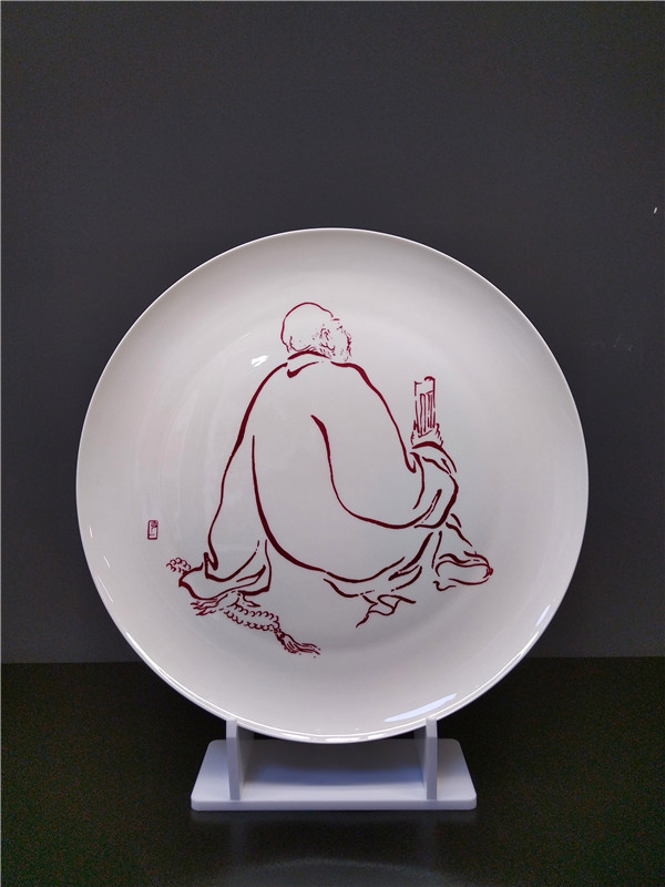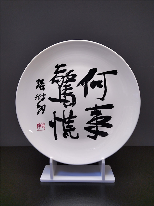 在刀法运用上,他将篆刻的刀法精髓发挥到极致。刻制《弘一法师〈罗汉〉》时,他以细劲的“单刀”勾勒罗汉的衣纹与身形,线条简洁却气韵生动,51公分直径的瓷盘上,罗汉静坐的背影通过刀痕的深浅、疏密展现出布料的褶皱与人物的沉静,单刀的利落与篆刻“冲刀”的爽利相融,让瓷面线条既有书画的柔韵,又有金石的刚劲;而在书法类刻瓷作品《何事惊慌》中,他则运用“复刀”技法处理笔墨的浓淡干湿,46公分直径的瓷盘上,“何事惊慌”四字笔墨豪放,刀痕随书法的笔触起伏,粗重处刀深力沉,纤细处轻刀浅划,完美还原了书法的笔意与气势,让瓷面成为“立体的书法作品”。