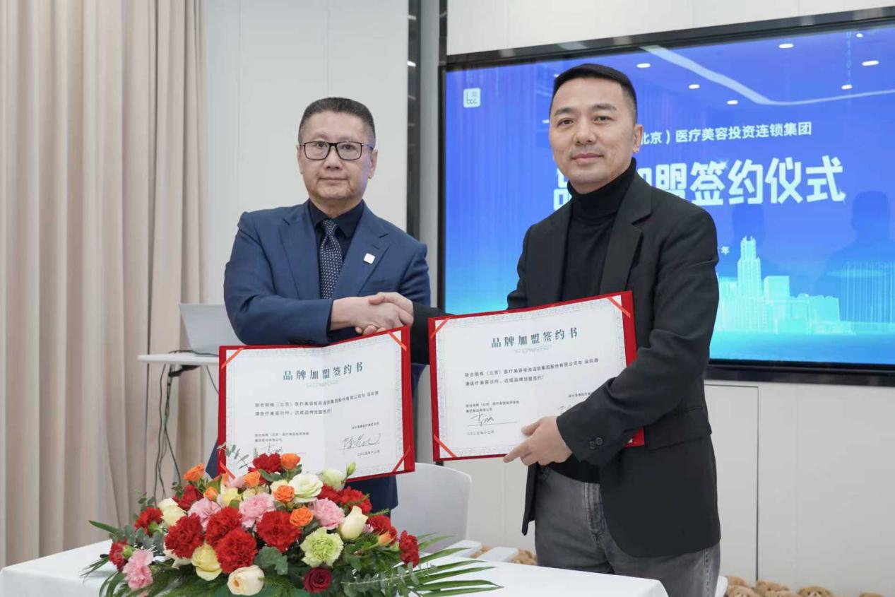 联合丽格集团董事长李滨(图左)与深圳清潭医疗美容代表陈凯(图右)达成品牌加盟签约。