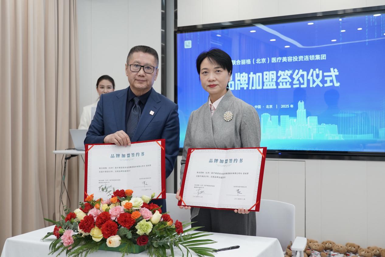 联合丽格集团董事长李滨(图左)与深圳罗文医疗美容创始人罗文(图右)达成品牌加盟签约。