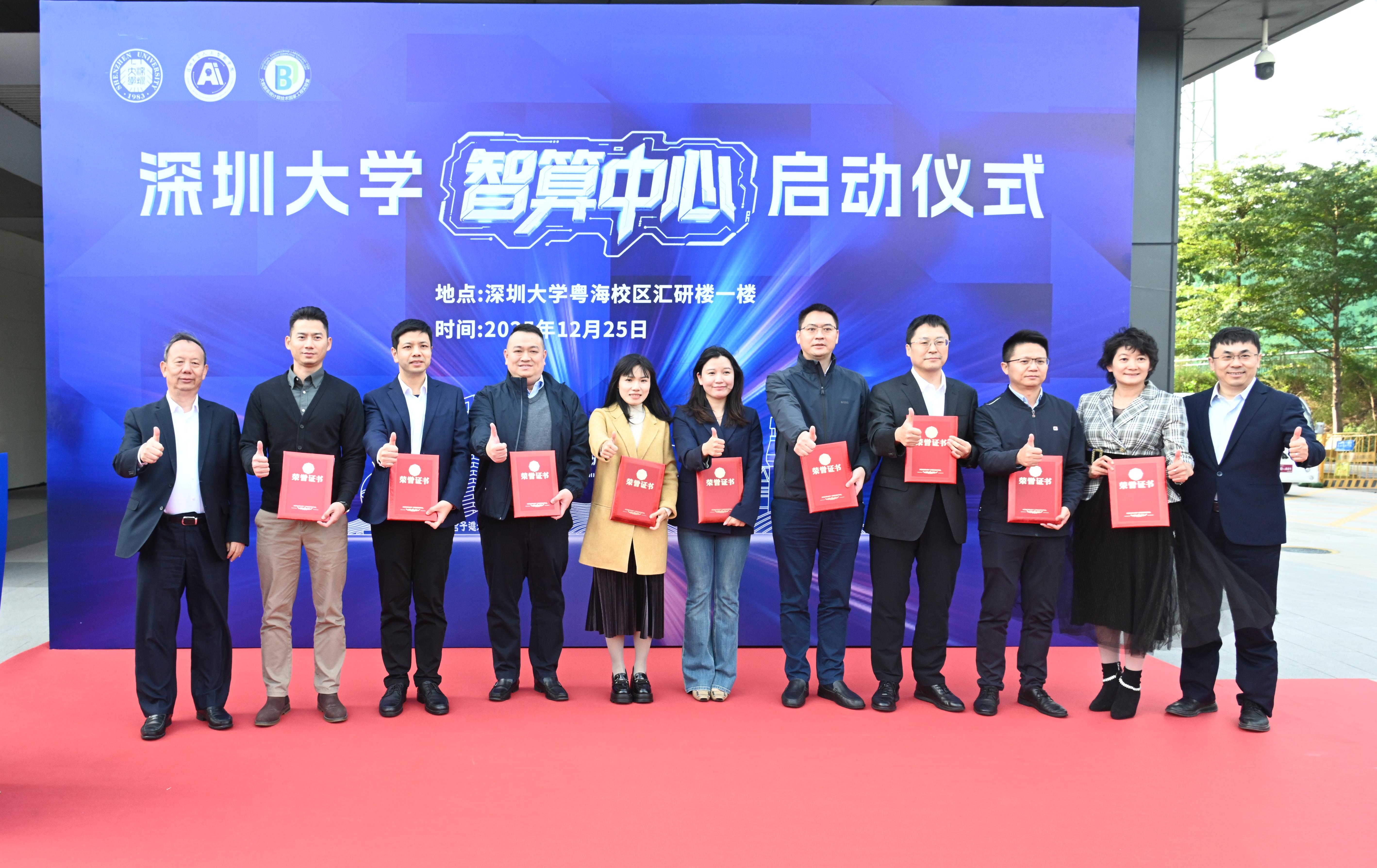 深圳大学科学技术发展研究院、后勤保障部、人力资源部、实验室与国有资产管理部、物理与光电工程学院、人工智能学院、高等研究院、信息中心、资产经营有限公司等单位负责人,以及深圳移动、深圳电信、深圳联通、华为、中兴通讯、腾讯等深圳大学智算中心共建单位的领导、专家共同出席并见证中心启动。