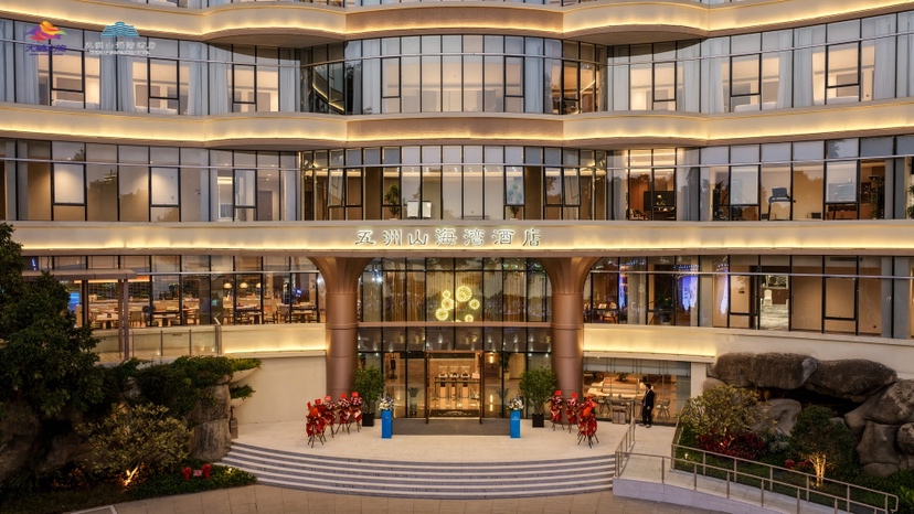 记者在现场看到,该酒店设计深度呼应自然肌理,外观以“流动的海岸线”为灵感,曲面玻璃幕墙倒映天光云影,温润色调让建筑与山海浑然一体。