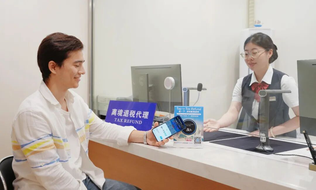 在万象城的离境退税“即买即退”集中退付点,两名税务干部正在退税现场办公,为消费者和商户提供单据核验、政策疑难咨询等服务。梁靖怡说:“为了进一步优化退税体验,我们与辖区税务部门建立了直连机制,税务部门提供了驻点服务和专项培训。离境退税‘即买即退’新规实施以来,针对数码电子、奢侈品等业态累计开展7次培训,帮助商户合规经营、无忧退税。”