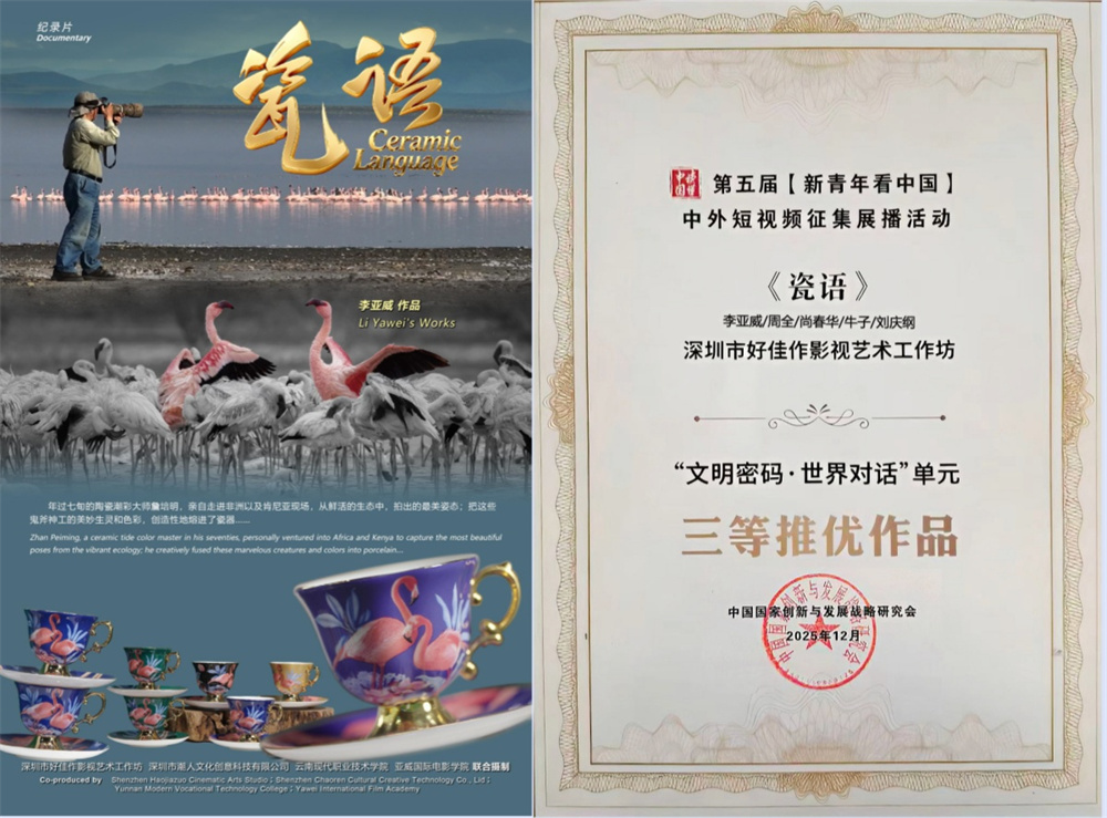 《瓷语》则获得第五届“新青年看中国”中外短视频征集展播活动“文明密码・世界对话”单元三等推优作品,影片讲述七旬陶瓷潮彩大师詹培明深入非洲肯尼亚拍摄生态生灵,将其姿态与色彩创造性熔铸于瓷器的独特实践,展现了传统工艺与跨文化视野的创新融合,在中国同类创作中实属罕见。