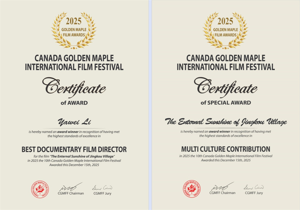▲纪录片《走哪儿拍哪儿》荣获第十届加拿大金枫叶国际电影节“最佳纪录片”奖。