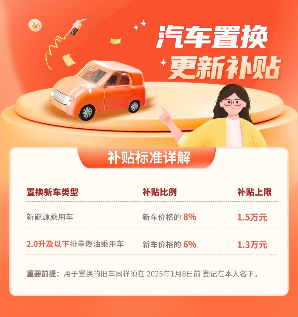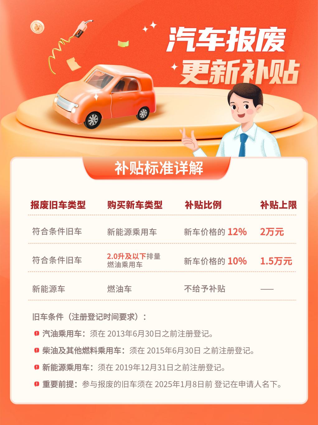 政策对参与车辆的资格有明确规定。报废更新中,报废的汽油乘用车注册登记时间须在2013年6月30日前,报废的柴油及其他燃料乘用车注册登记时间须在2015年6月30日前,报废的新能源乘用车注册登记时间须在2019年12月31日前。无论是报废更新还是置换更新,旧车均须在2025年1月8日前登记在申请人名下。