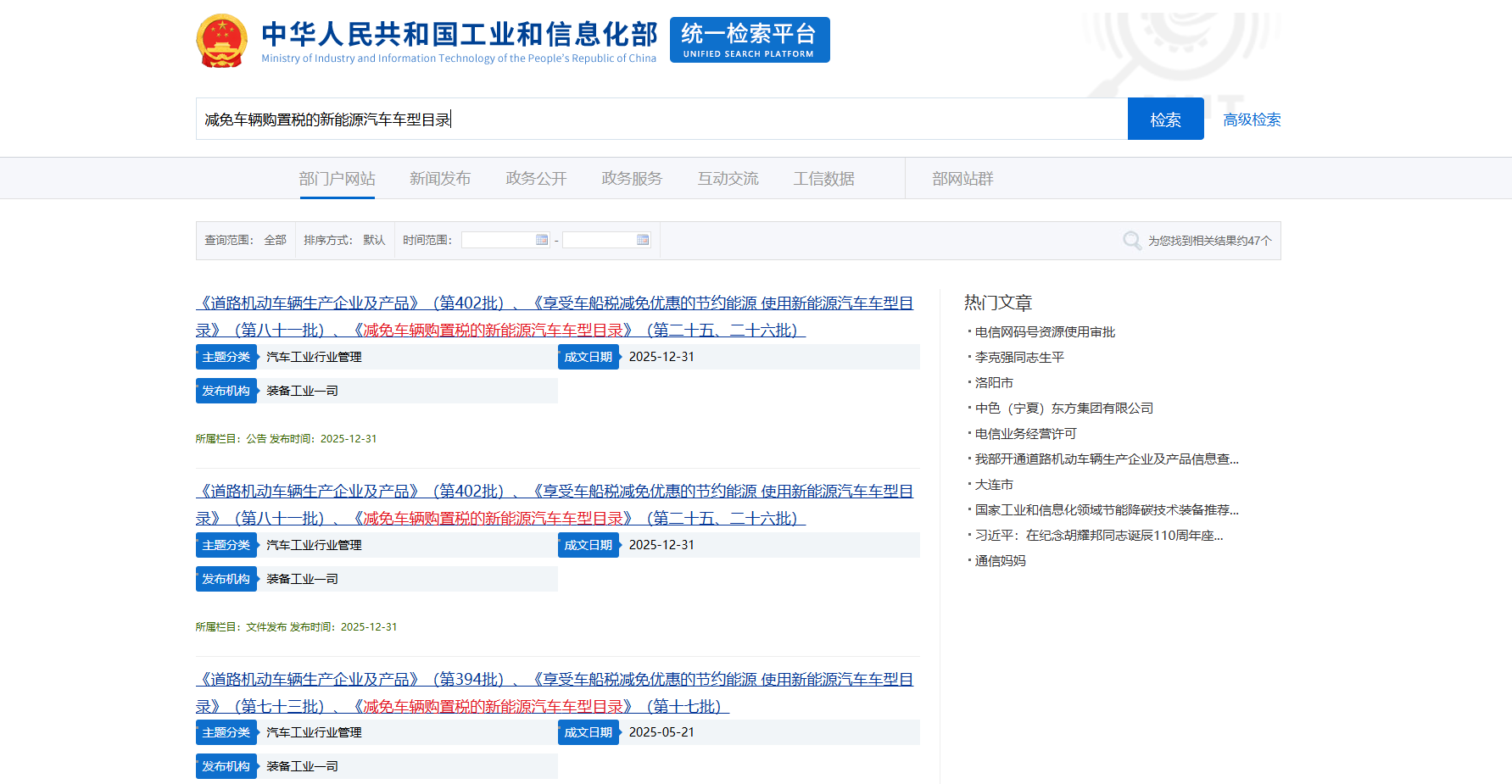 新能源汽车的补贴资格以《减免车辆购置税的新能源汽车车型目录》为准。消费者可通过访问中华人民共和国工业和信息化部官方网站(https://www.miit.gov.cn/ ),在搜索框中输入“减免车辆购置税的新能源汽车车型目录”进行查询,确保所购车辆符合补贴条件。